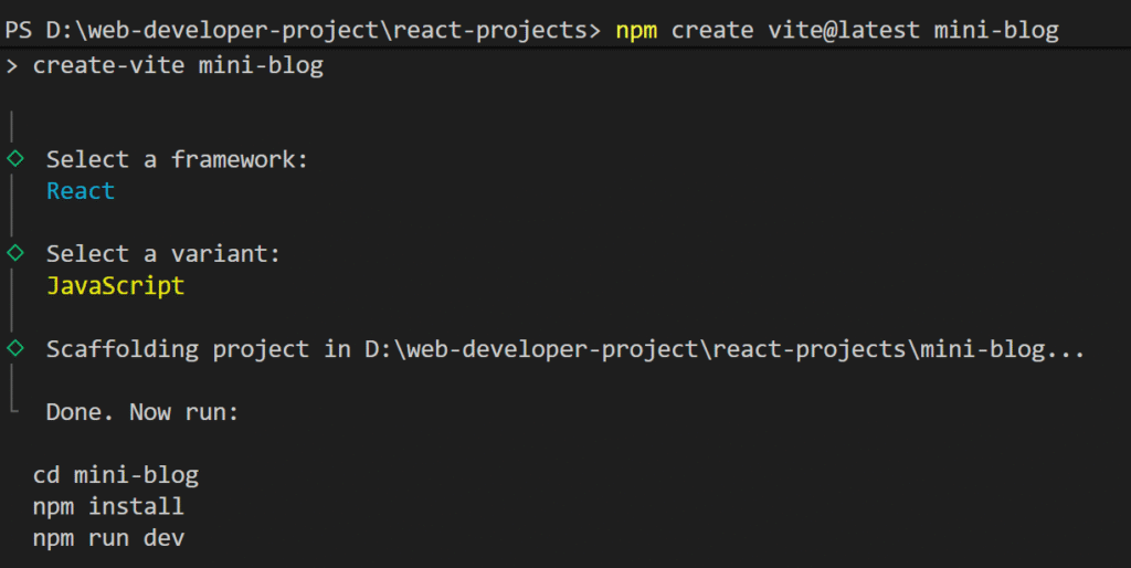 - Select a framework: Select React using Down and Up Arrow Key from the keyboard.